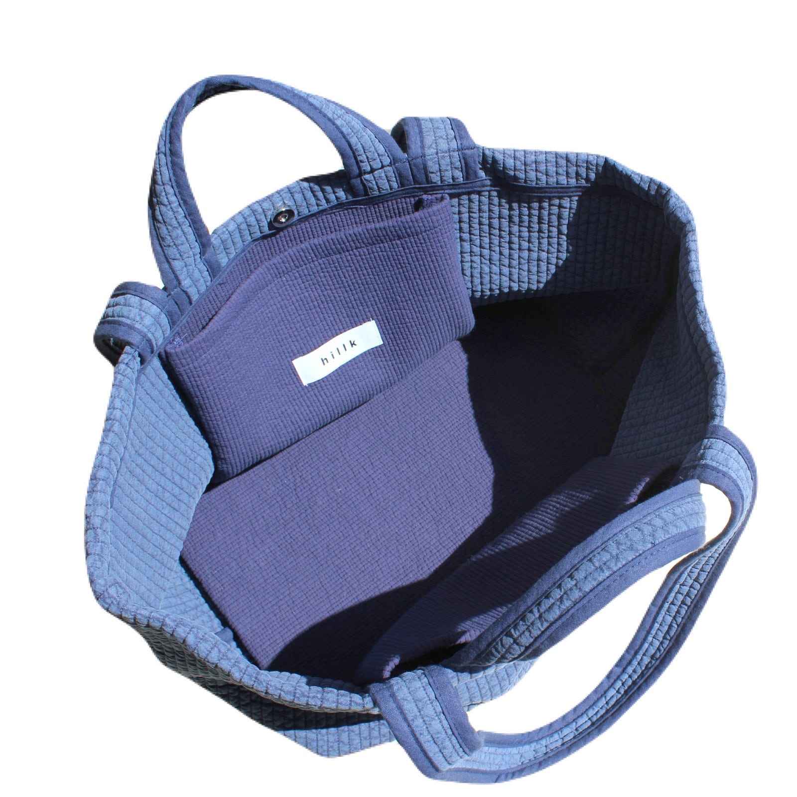 細いヌビを使用して作られた底板入り。マチが大きく大容量で自立する点は、hillk オリジナルならではの使いやすいポイントです。